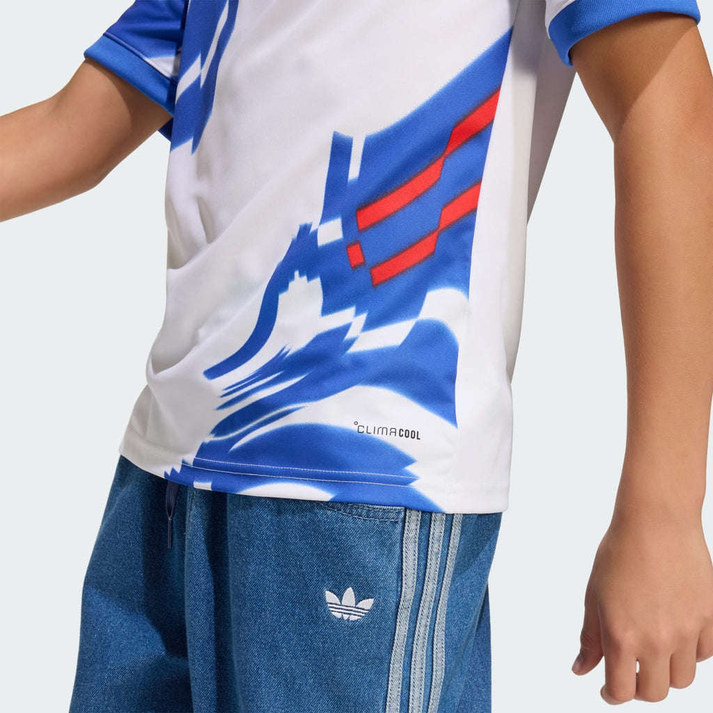 La Camiseta Visitante Universidad de Chile 26 para Niños se inspira en las vibrantes banderas que ondean los hinchas, capturando el espíritu del escudo "Chuncho" y acercando a los jóvenes seguidores al equipo. Esta camiseta de fútbol utiliza la tecnología Climacool para ayudar a tus hijos a mantenerse frescos durante el juego. El escudo del club tejido y los detalles gráficos únicos le dan autenticidad y un estilo deportivo y divertido. Ya sea marcando goles o animando desde las gradas, esta camiseta ofrece comodidad y estilo a los pequeños aficionados al fútbol. Luce con orgullo tu pasión con adidas.