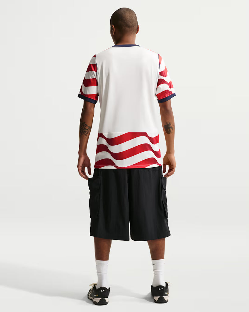 Nike presenta el jersey de local de USMNT 2026. Orgullosamente rojo, blanco y azul, el uniforme luce rayas onduladas que evocan a tu equipo y su bandera ondeando en lo más alto.