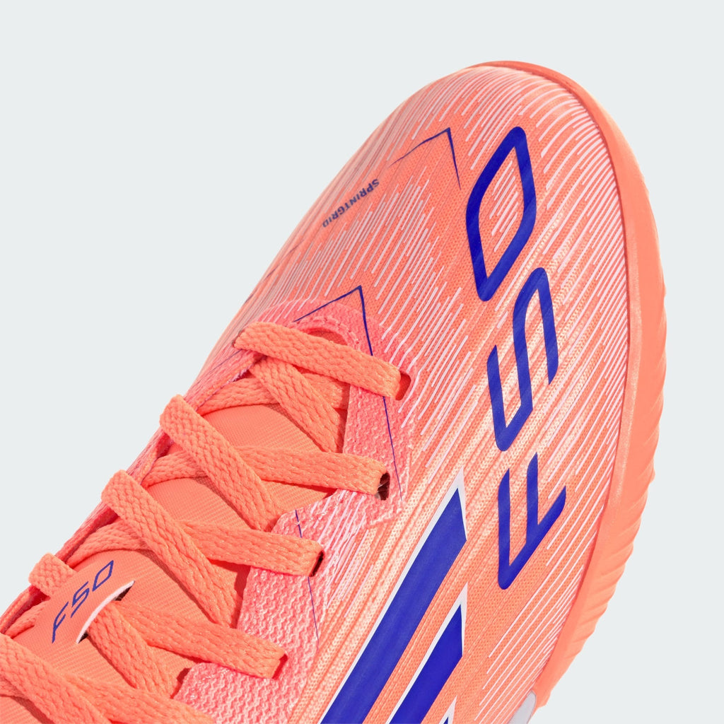 Encuentra tu velocidad para expresarte de verdad en la cancha. Siente la adrenalina con los zapatos de fútbol adidas F50, hechos para correr. El exterior Fiberskin de estos zapatos de fútbol League para jóvenes luce un llamativo estampado Sprintgrid y cuenta con una lengüeta perforada que te mantiene fresco mientras juegas. La suela de caucho con taches ofrece velocidad en superficies de césped artificial.